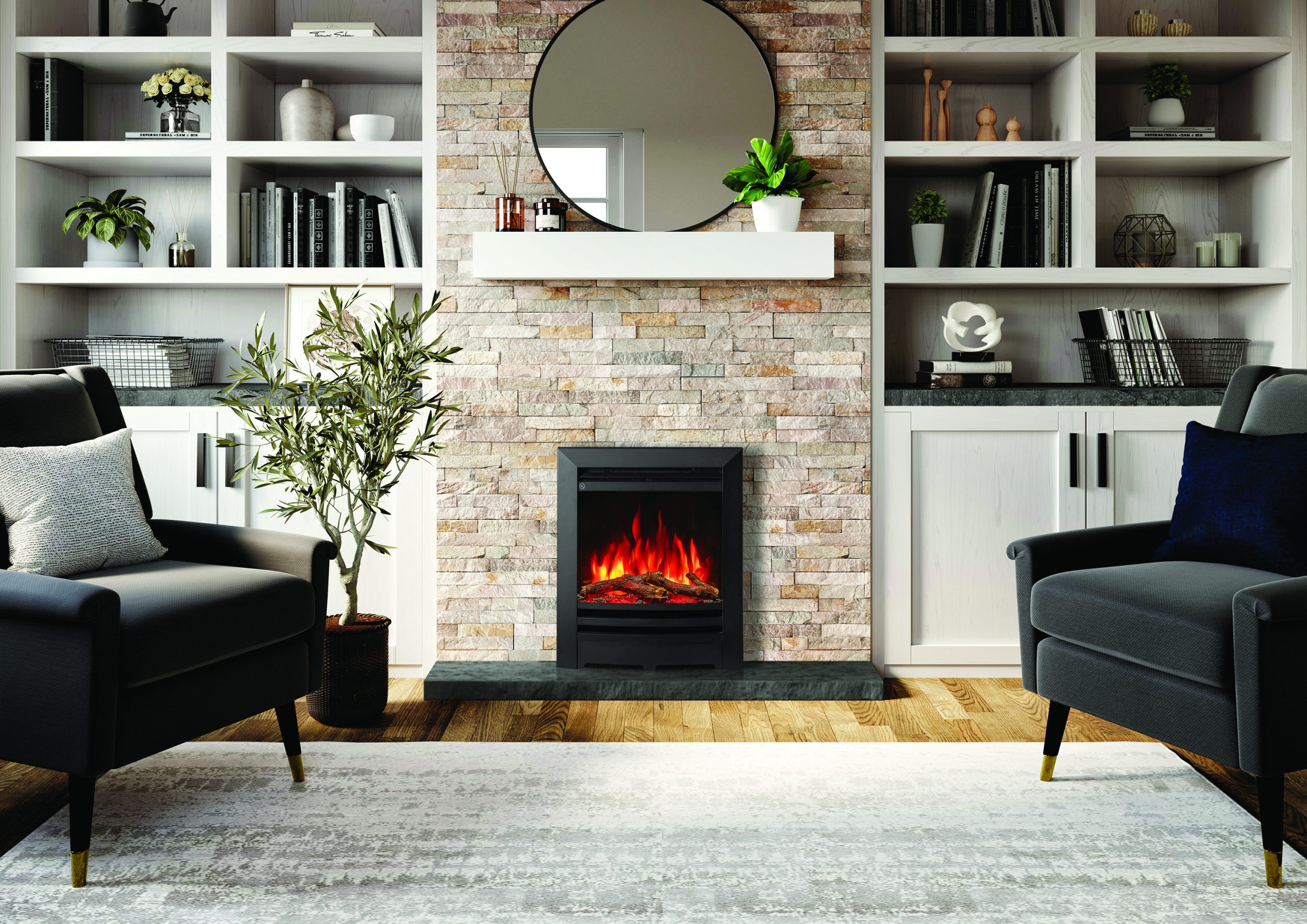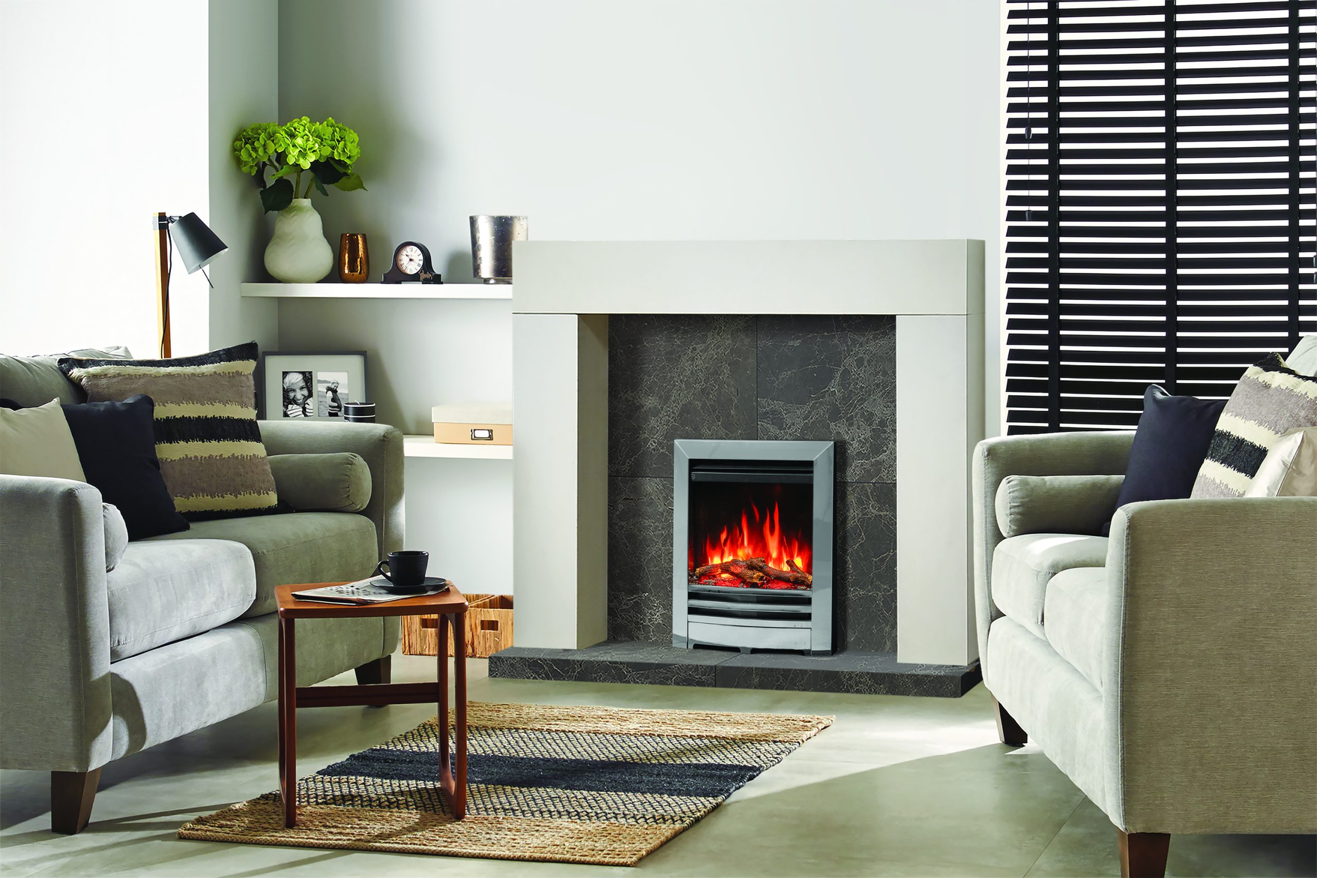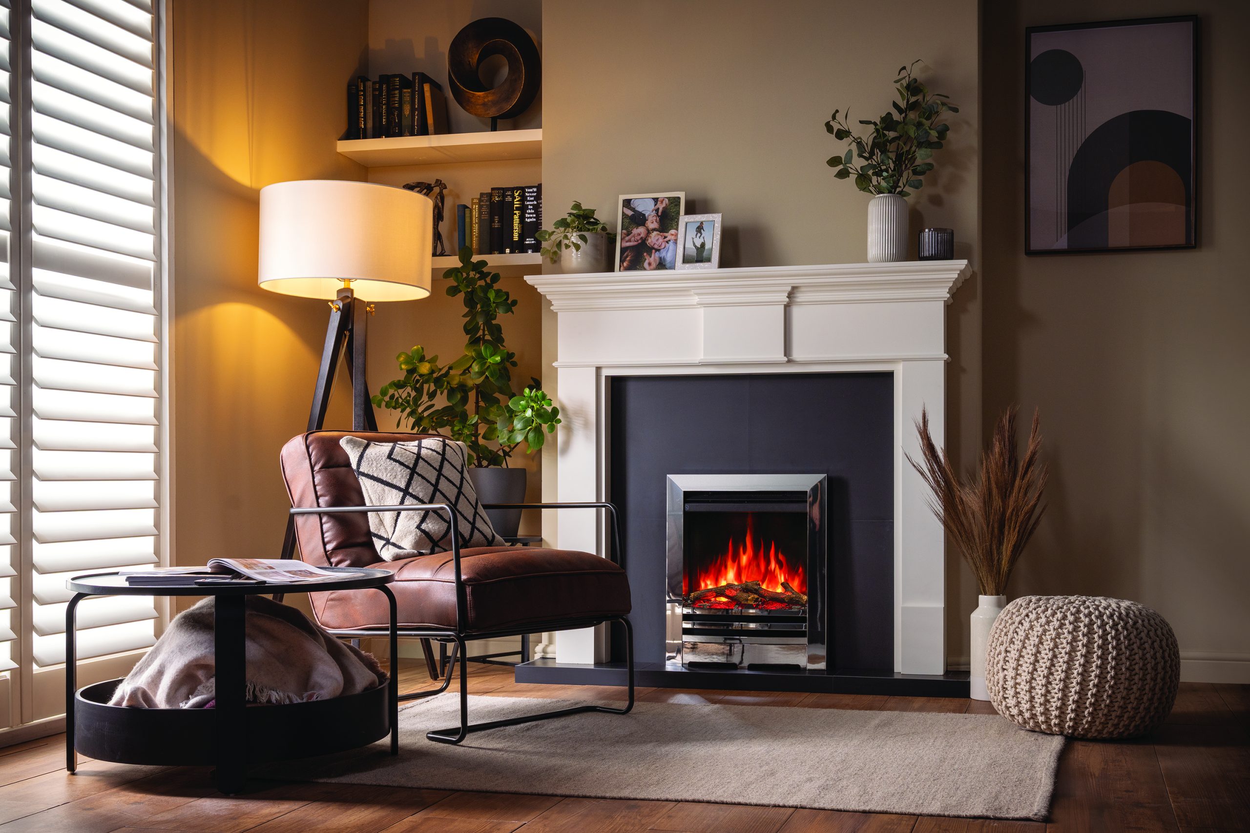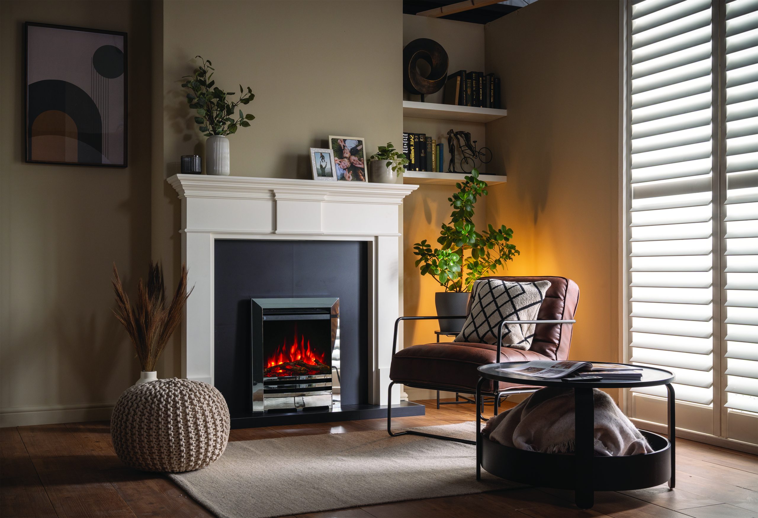 Choose from five flame colours and five brightness levels to tailor the fire’s appearance to your space and mood.