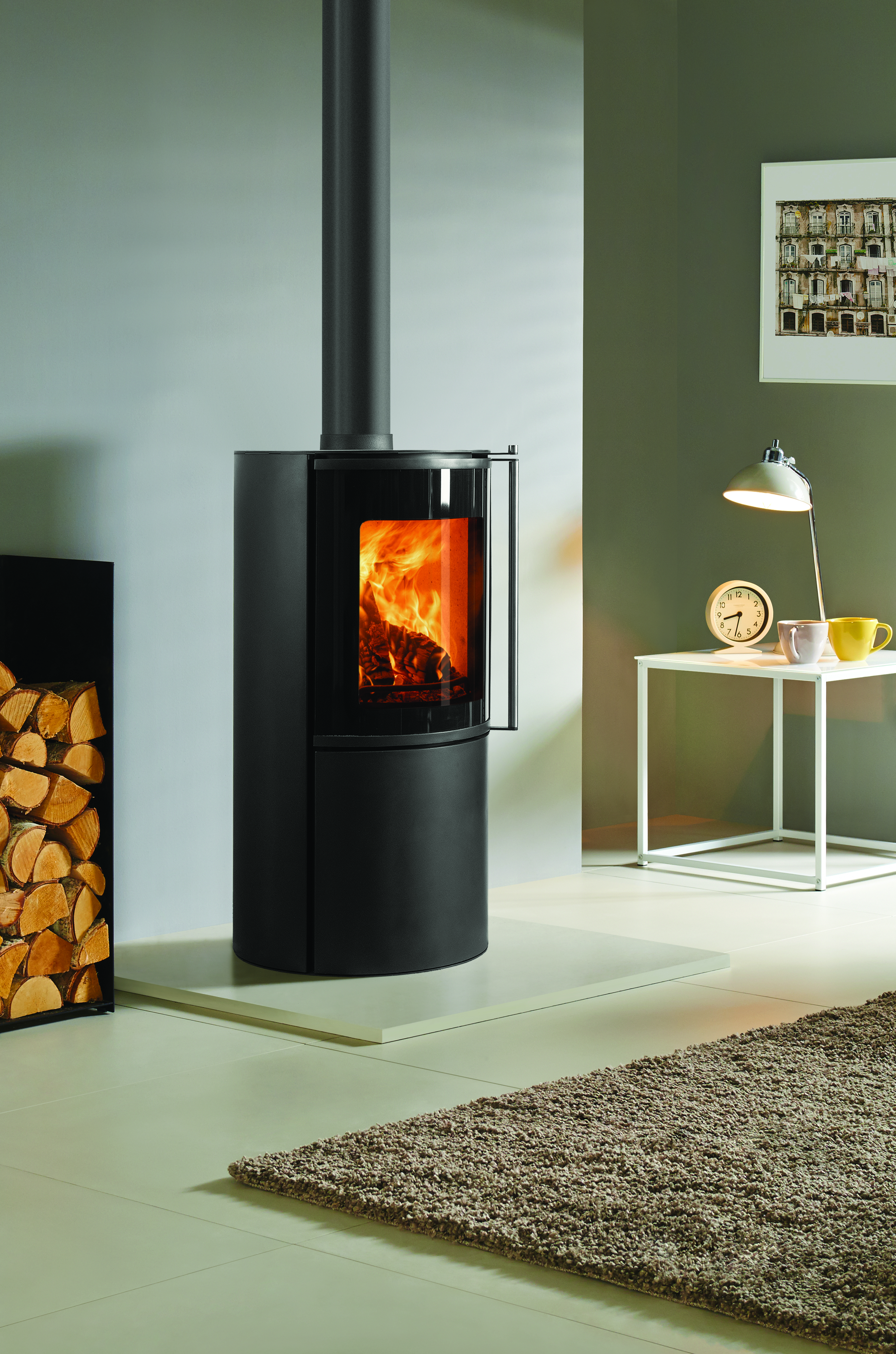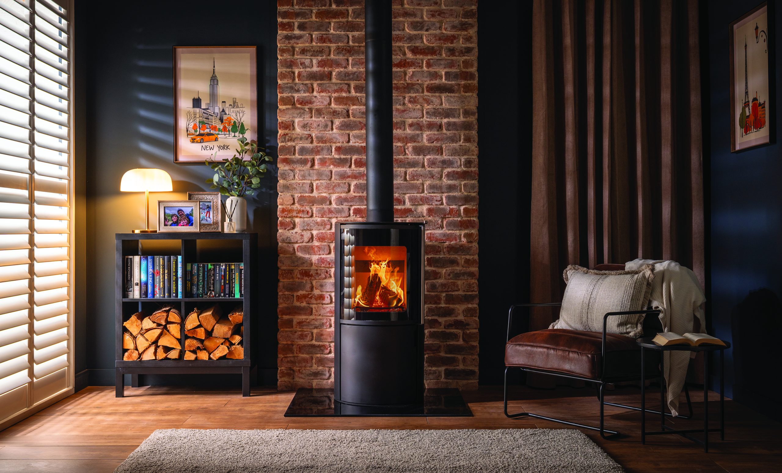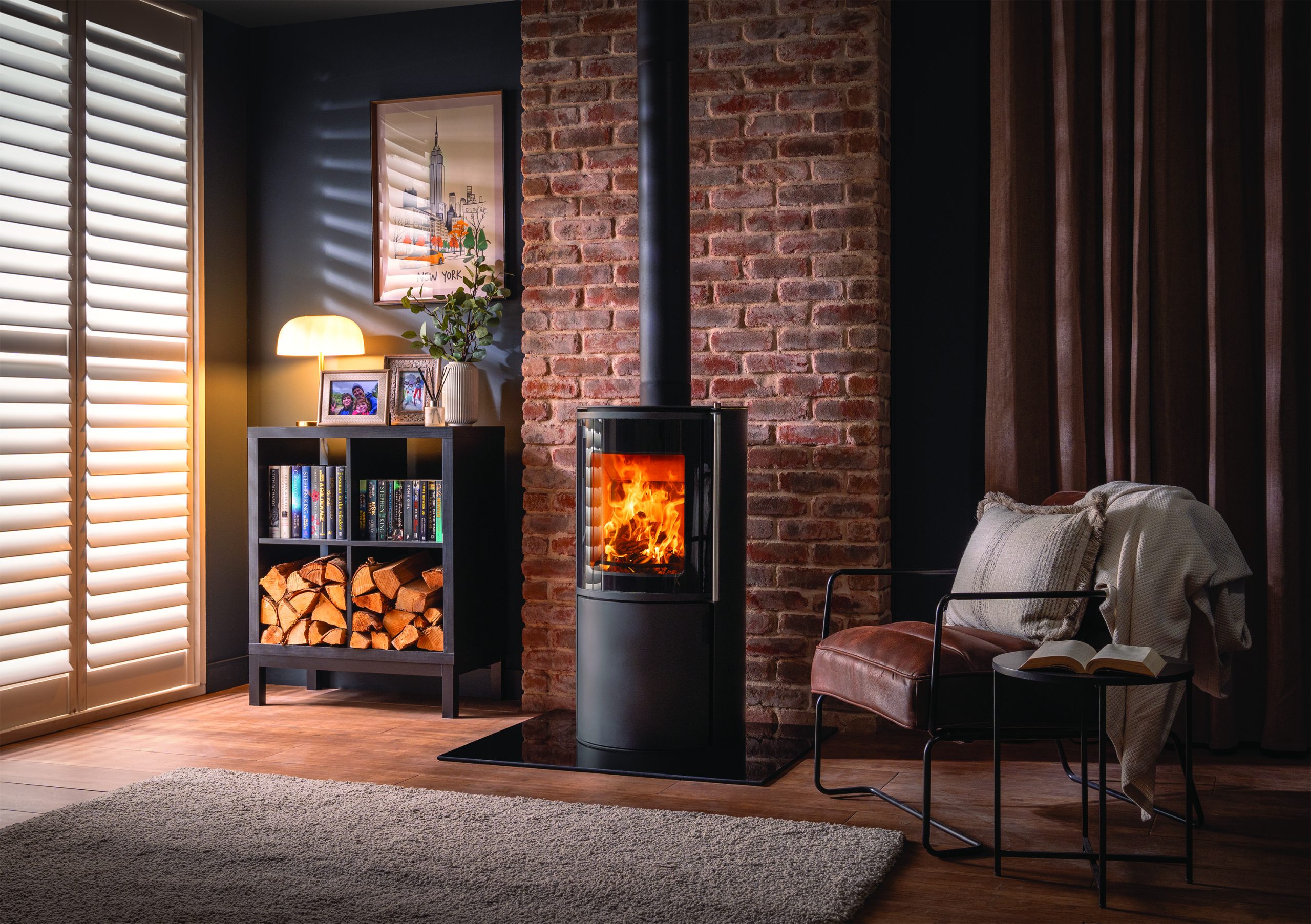 Cylindrical, tall and captivating, the FireFX Atlas woodburning stove range blends Scandinavian elegance with British practicality. Each model – Atlas 1, 2 and 3 – is crafted from robust steel and cast iron, combining striking presence with enduring performance. A curved glass window offers a stunning, uninterrupted view of the flames, while the Atlas 2 and Atlas 3 expand the experience with side panels for a panoramic 180° display. The Atlas 3 goes further still, with sleek extended black glass creating a seamless, architectural finish. Delivering up to 82% efficiency, the Atlas range produces powerful convected heat for balanced warmth throughout the room. Every model is Ecodesign compliant and DEFRA-exempt, ensuring cleaner, efficient burning even in smoke control zones. Thoughtful touches such as concealed log storage behind the lower door and optional external air supply complete the design, bringing modern refinement to fireside comfort.