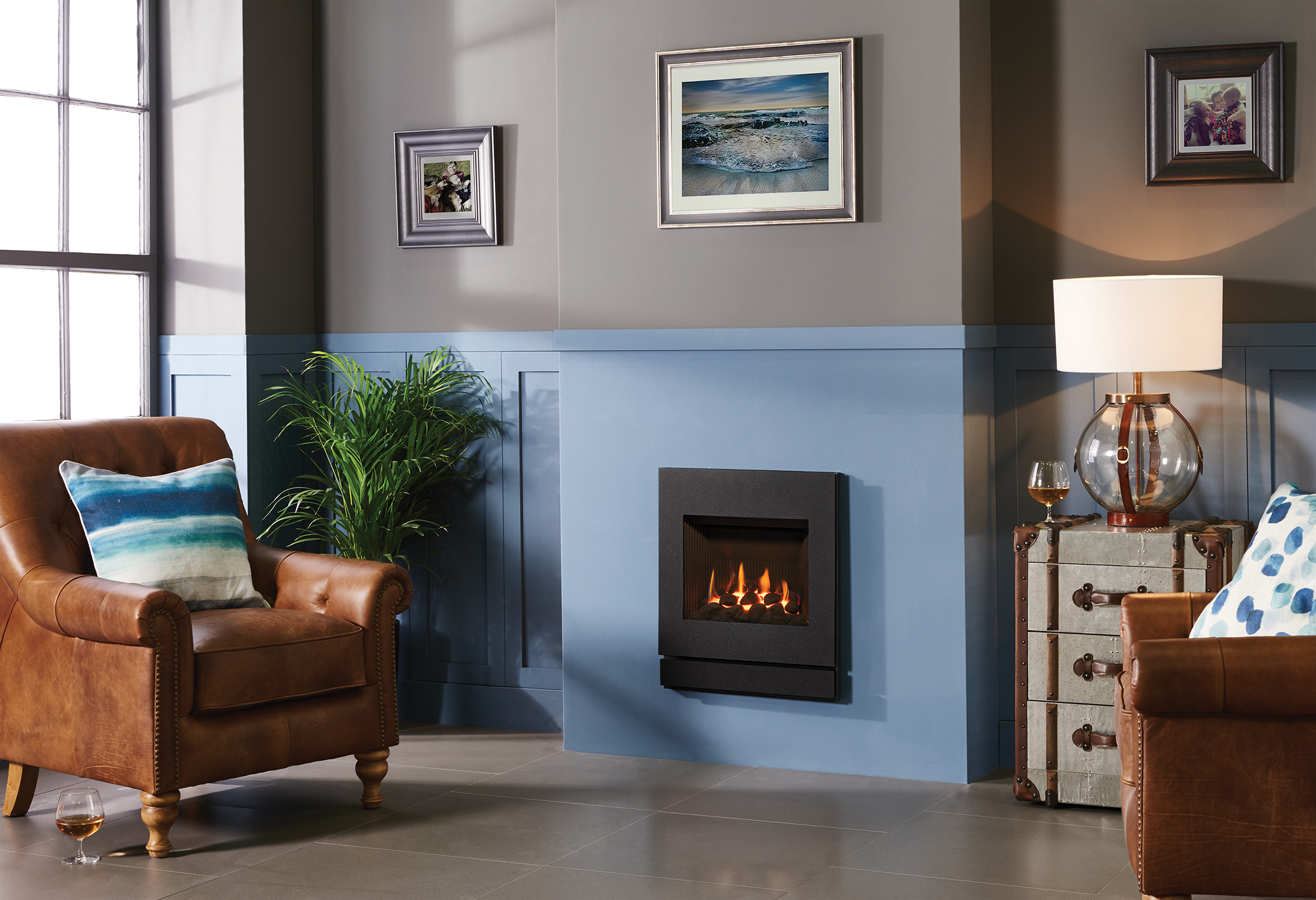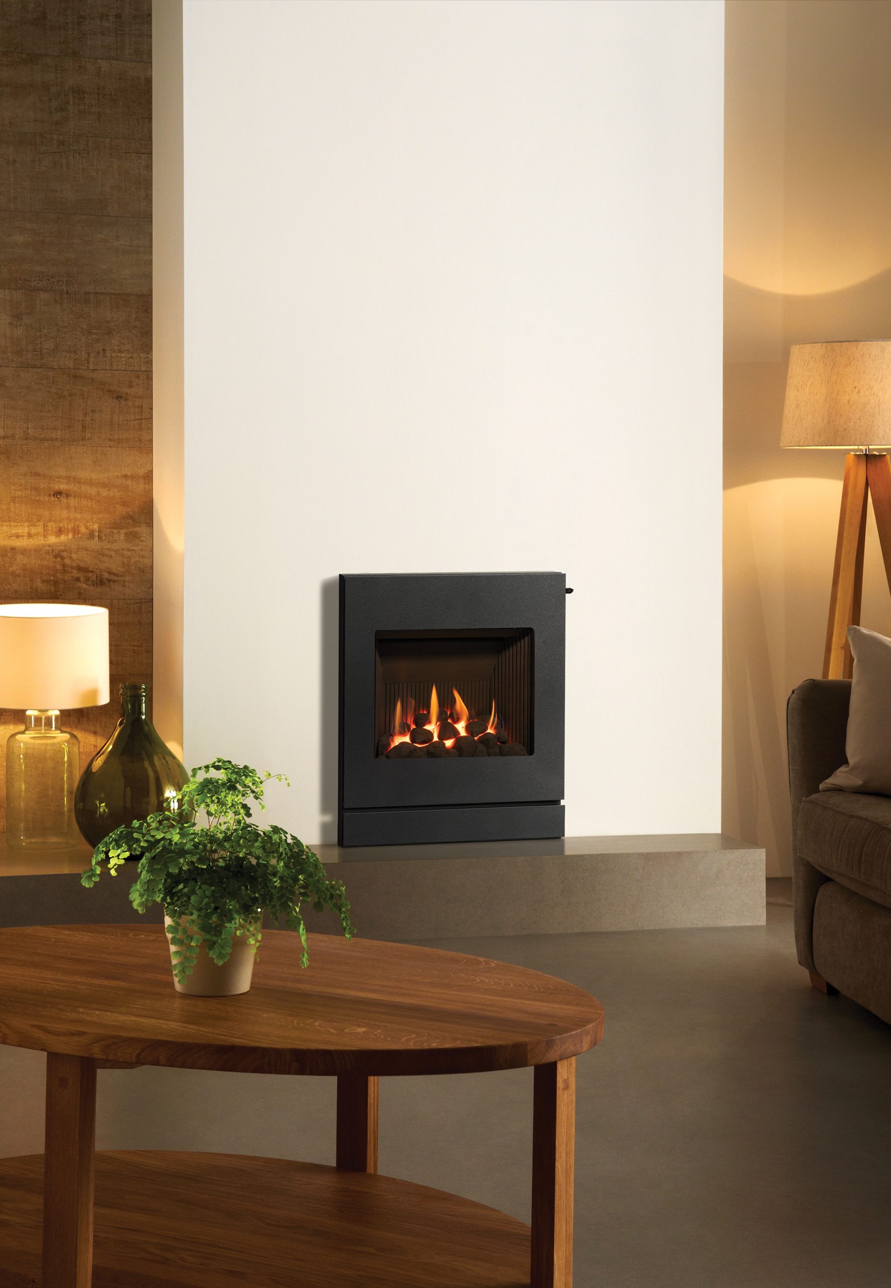The Designio2 Steel front is available in a stylish bold Graphite finish and suitable for both hearth mounting and inbuilt installations further up the wall.